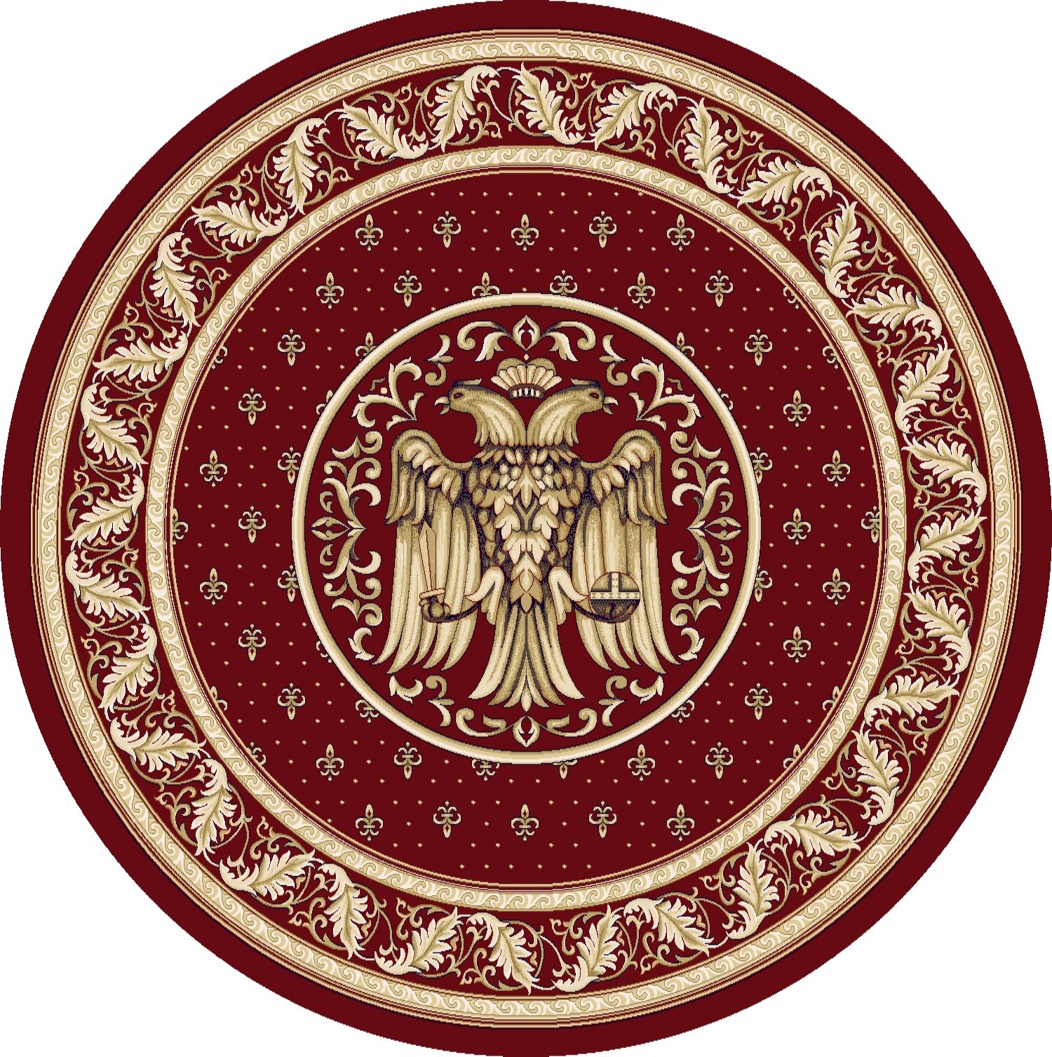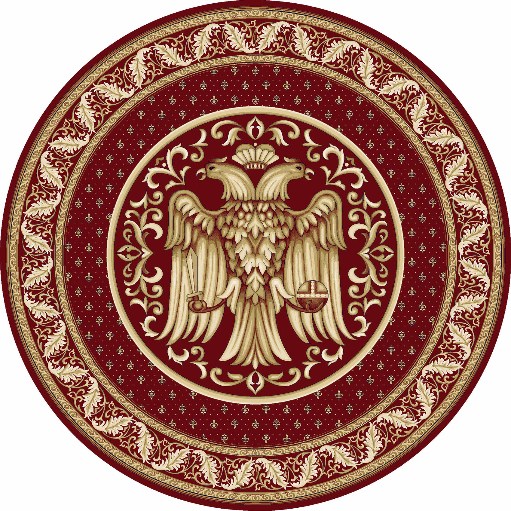 Covor Rotund Biserică 5416 Grena – Cu Vultur Bicefal reunește tradiția și eleganța într-un design care onorează simbolistica ortodoxă. Acest covor rotund este perfect pentru biserici, oferind un aspect solemn și demn, cu un motiv central reprezentând vulturul bicefal bizantin, înconjurat de detalii aurii ce strălucesc pe un fond grena/bordo. Bordura cu frunze acanthus completează acest design, aducând un aer regal lăcașului de cult.
